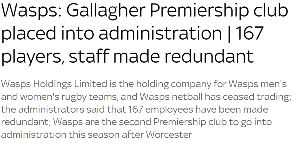 Nearly twelve months then. Nearly twelve months since we got the news we were dreading, and many of the Coventry City fans seemed to be dreaming of. Wasps were heading into administration. A few days later, the reality really hit when every single member of Wasps staff was made redundant. This was twelve months ago. Headline below still makes for terrible reading.